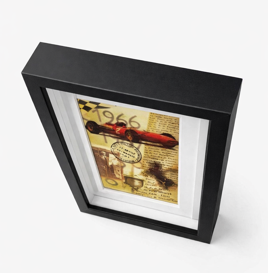 En el interior del marco se encuentra una lámina estilo collage inspirada en el mundo de las competiciones históricas, con iconografía racing de los años 60, monoplazas clásicos y detalles gráficos retro. Un complemento decorativo ideal para oficina, estudio, garaje, showroom o cualquier espacio dedicado a los coches clásicos.