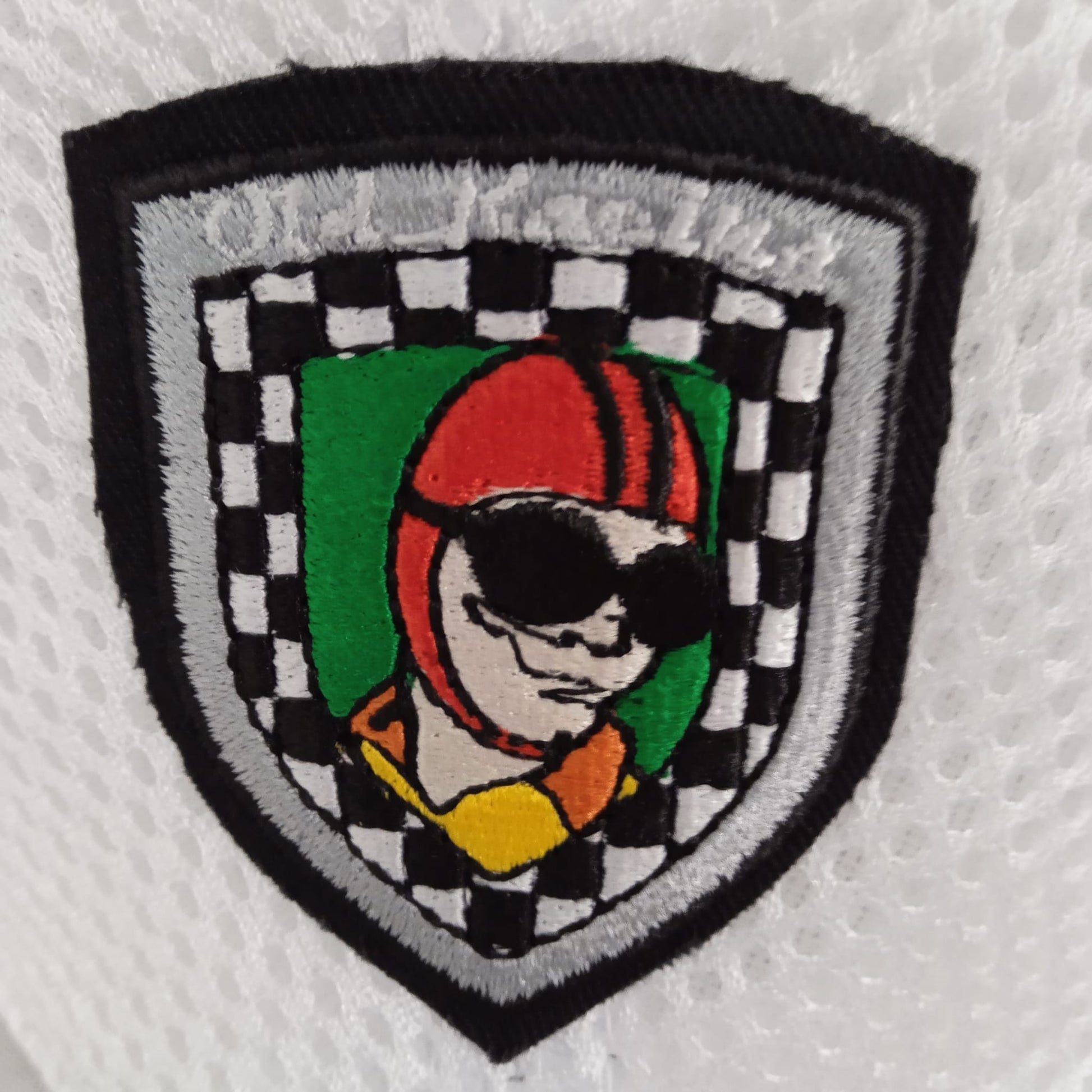 Logo bordado Old Racing y pin decorativo con tema de banderas racing.
